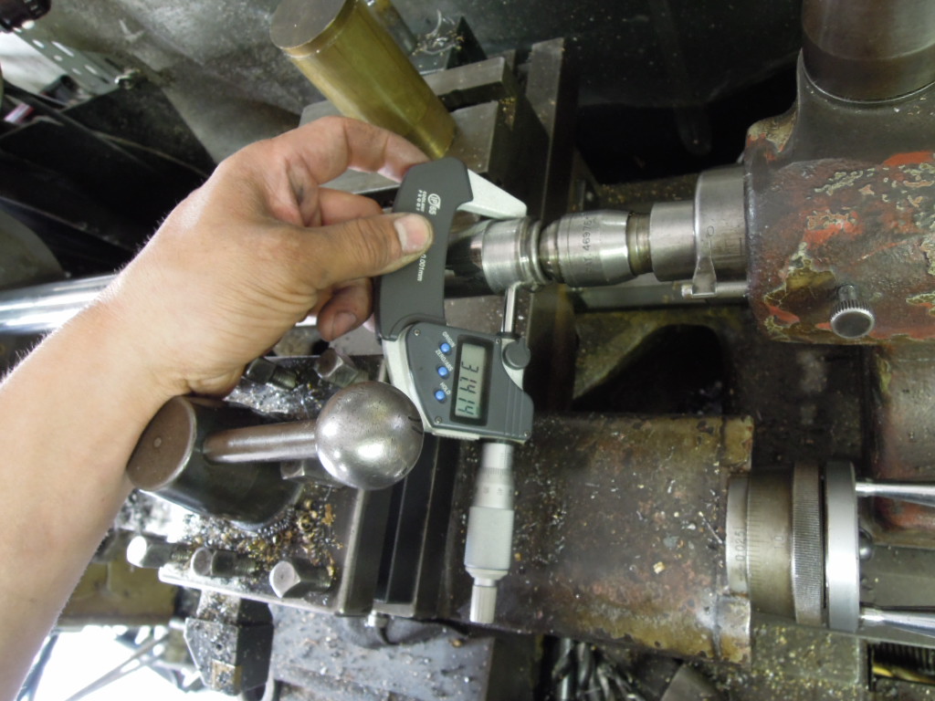ん?何してんの?ってな写真ですが、、、、今回、「タンクのアールに合うカッコイイハンドシフト作ってよ」との依頼があり、いろいろ考えましたところ、どうも真っ直ぐな丸棒じゃイマイチな感じになりそうなので、丸棒を先細りになる様に旋盤で加工します。